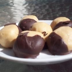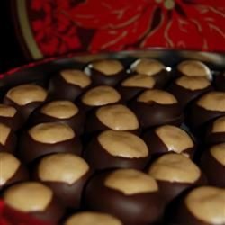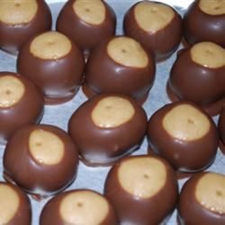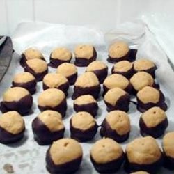 4With a toothpick inserted in the balls, dip them into the chocolate so they look like buckeyes. Place on waxed paper and allow to set in refrigerator.