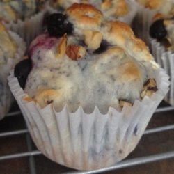 2Stir the flour, sugar, baking powder, and salt together in a large bowl. Beat the egg, milk, and oil together in a separate bowl. Make a well in the center of the flour mixture; pour the egg mixture into the well, and stir until the flour mixture is just moistened. Be sure to not over-mix. Fold the blueberries and walnuts into the batter. Spoon the batter into the prepared muffin cups to about 3/4 full.