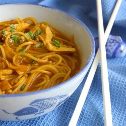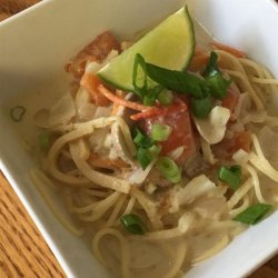2Pour chicken stock into onion mixture and increase heat to medium-high; cook until simmering, 3 to 4 minutes. Add soy sauce, fish sauce, and remaining 1/2 cup coconut milk; cook until heated through, 2 to 3 minutes. Add angel hair pasta, cover pot with lid, and cook until pasta is tender yet firm to the bite, about 10 minutes. Stir basil into soup.