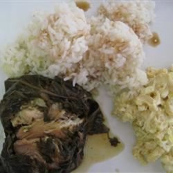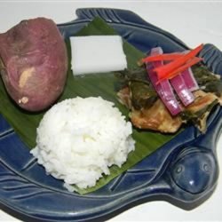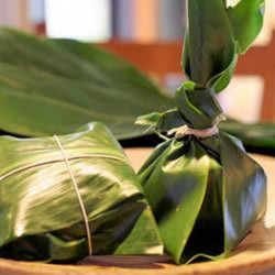 2Place 1/4 of each of the fish, pork and chicken onto the center of 3 or 4 taro leaves. Wrap securely with the taro leaves, then place each wrap on a set of ti leaves. Tie the ends of the ti leaves together with a piece of string.