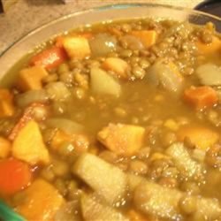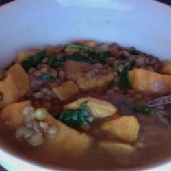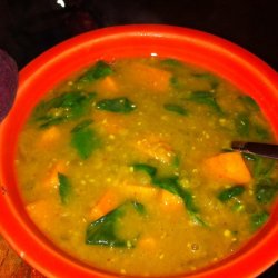 "Lentils, sweet potatoes, onions, and spinach are a few simple vegan ingredients are cooked with aromatic and flavorful Indian spices to quickly create an utterly delicious and hearty meal. Thanks to our family friend Wendy for this keeper!"