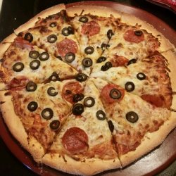 4For a round pizza, break off about 2 cups of the dough. Grease a 15 inch round pan, and sprinkle lightly with corn meal. Roll out the dough to fit the pan, stretching it to fit. Brush crust with olive oil, and sprinkle with cheese. Add desired toppings.
