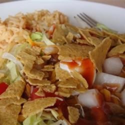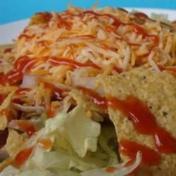 Crumble tortilla chips on a large plate. Layer with the beef, lettuce, tomatoes, cheese, onion and taco sauce.