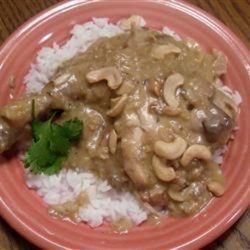 "This is a delicious way to eat cashew chicken without the hassle! It uses a whole chicken cut into pieces combined with a creamy soup, rice and cashews."
