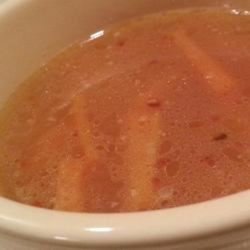 2Mash the garlic with a fork into a coarse paste. Pour in remaining chicken stock, increase heat to medium-high, and bring to a boil. Stir in carrots and cook for 1 minute, then add red pepper and continue cooking until vegetables are tender. Season to taste with salt and pepper before serving.