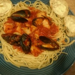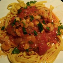 3In a large skillet, heat the remaining 2 tablespoons of olive oil over high heat. Add the shrimp and scallops. Cook for about 2 minutes, stirring frequently, or until the shrimp turn pink. Add shrimp and scallops to the tomato mixture, and stir in the parsley. Cook for 3 to 4 minutes, or until the sauce just begins to bubble. Serve sauce over pasta.