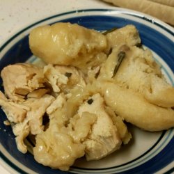 1Combine chicken, cream of mushroom soup, onion, butter, rosemary, and black pepper in a slow cooker; add enough vegetable broth to cover the ingredients completely.