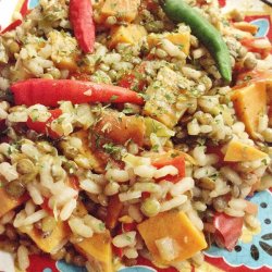 1In a large saucepan over medium heat, brown the sausage until no pink shows. Stir in the onion and green pepper, and saute until the onions are tender. Stir in the lentils, rice and chicken broth. Reduce heat, cover, and simmer for 40 to 60 minutes.