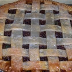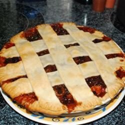 4Preheat oven to 350 degrees F (175 degrees C). Put filling in unbaked pie shell and place pastry on top. Crimp edges and poke several holes in top pastry. Brush top with cream and sprinkle with sugar.