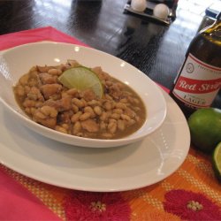 2Pour in the lime juice, chopped green chilies, and chicken broth, then bring to a simmer. Reduce heat to medium-low and cook 45 minutes. Stir in the rinsed white beans, and cook 10 more minutes to reheat. Stir in the Pepper Jack cheese until melted to serve.