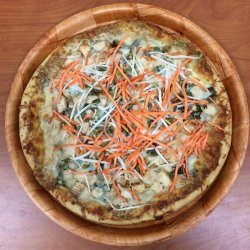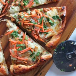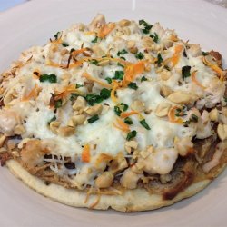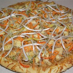 2In a small bowl, stir together the peanut sauce and peanut butter. Spread over the pizza crust. Arrange strips of chicken on top. Sprinkle on the green onions and cheese.