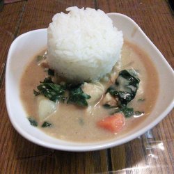 1Heat the oil in a large, heavy skillet over medium-heat heat; cook the chicken in the skillet until completely brown, 5 to 7 minutes; remove and set aside. Add the onion, potatoes, garlic, pepper, salt, coriander, cumin, and red pepper to the skillet and cook until the onions soften, about 5 minutes. Stir in the water, chicken broth, and peanut butter. Return the chicken to the skillet and top with the spinach. Cover and simmer until the potatoes are cooked through, about 20 minutes.