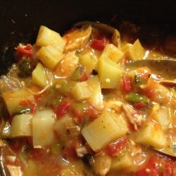 3Remove chicken from pot, and set aside to cool. Add green chilies and tomatoes to simmering stock.
