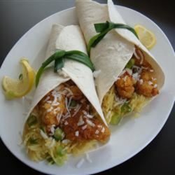 5On each tortilla, place equal amounts of rice, chicken, coconut, and green onions. Wrap burrito style.