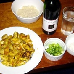 3In a small bowl, mix the flour, curry powder, and garlic salt. Drain the chicken, and discard marinade. Dredge chicken in the flour mixture to coat.