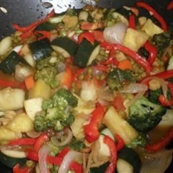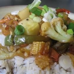 2Heat the oil in a large skillet; fry the garlic in the hot oil until browned, 7 to 10 minutes. Add the onion; cook for 1 minute. Stir the cauliflower and carrot into the mixture; cook and stir for 1 minute. Mix the cucumber, corn, and peas into the mixture; cook for 1 more minute. Stir the bell pepper and tomato into the mixture; cook 1 minute. Pour the sauce over the mixture, add the pineapple, and toss so the entire mixture is evenly coated in sauce; cook another minute. Serve hot.