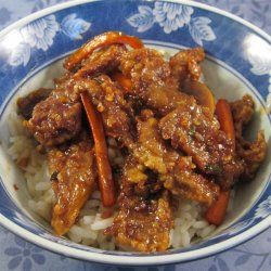 2Pour oil 2 to 3 inches deep in a wok; heat to 350 degrees F (175 degrees C). Cook beef strips in oil, working in batches, until brown and crisp, about 4 minutes; remove to drain and keep warm. Repeat with remaining beef.