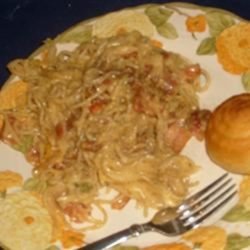 1In a large skillet, cook the bacon and remove to a paper towel-lined plate. Add the onion to the bacon drippings and cook until clear (about 5 minutes). Add the spaghetti and the bacon to the onions and toss until well mixed.