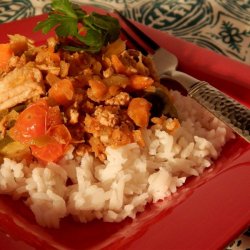 1Mash garlic in the bottom of a saucepan. Stir curry paste with the garlic; add onion and bell pepper. Cook and stir over medium-low heat until the onions are golden, about 5 minutes.