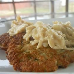 3Melt remaining 1 tablespoon margarine in a large skillet over medium-high heat. Place 1/4 cup scoops of the zucchini mixture in the skillet in batches, flattening each mound slightly to form a pancake. Pan-fry until golden brown, 5 to 6 minutes per side.