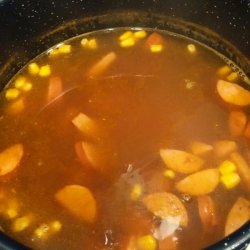 2Heat vegetable broth in a saucepan over medium heat until warm; add sweet potato and bring to boil. Cook until potato is tender, about 10 minutes. Stir sausage and corn into the broth with the sweet potato. Bring the mixture to a boil and serve immediately.