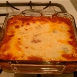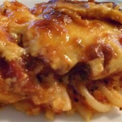 4In a large bowl toss pasta with Parmesan cheese and eggs. Press into a 9-inch pie plate and spread sauce mixture over pasta. Top with American cheese and sprinkle with mozzarella.