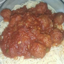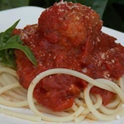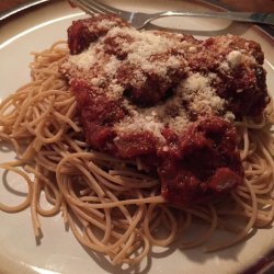 4Serve meatballs and sauce over spaghetti with a sprinkle of Parmesan cheese.