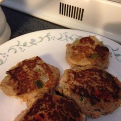 1Combine tuna, egg, bread crumbs, onion, celery, red bell pepper, mayonnaise, hot chili sauce, chili sauce, dill, salt, pepper, hot pepper sauce and Worcestershire sauce. Mix well. Shape into 4 patties (mixture will be very soft and delicate). Refrigerate for 30 minutes to make the patties easier to handle, if desired.