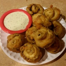 4Fry mushrooms in batches in the preheated oil until golden brown, 5 to 6 minutes.