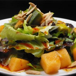 2Place the arugula leaves into a salad bowl, and sprinkle with the cantaloupe and avocado pieces. Drizzle with the salad dressing, then sprinkle with toasted almonds to serve.