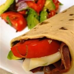 4Spread each tortilla with 2 tablespoons of hummus spread, and top each with 3 slices of crisped prosciutto per wrap. Place a slice of mozzarella cheese on top of the prosciutto, and spread 1/4 of the avocado slices per wrap on the cheese. Top each wrap with 1 sliced tomato and about 1/4 cup of torn lettuce leaves.