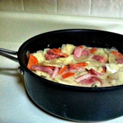 2Stir cream of mushroom soup, evaporated milk, water, onion, salt, and pepper into the reserved drippings in the skillet; add potato slices and carrot pieces. Place a cover on the skillet, reduce heat to low, and cook mixture at a simmer until potatoes and carrot are tender, about 35 minutes. Return ham to skillet and continue cooking until ham is hot, about 10 minutes.