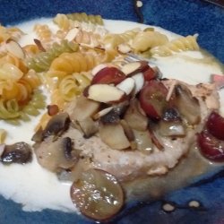 4To serve, place pork chops onto a serving platter and top with the mushroom mixture. Ladle Alfredo sauce over top, and sprinkle with grapes, almonds, and the remaining 2 tablespoons parsley to garnish.