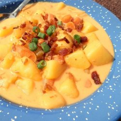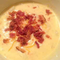 2Add milk; reduce heat to medium low and let simmer. Add cheese slices; when cheese is melted, slowly stir in dry potato flakes until mixture is slightly thickened. Sprinkle bacon on top and serve hot.