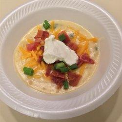 10Ladle soup into serving bowls and top with remaining bacon, green onions, and Cheddar cheese.