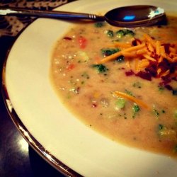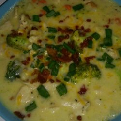 9Stir cooked potato, chicken, onion mixture, chicken stock, broccoli, 1/2 of the bacon bits, 1/2 of the green onions, and 4 ounces of the Cheddar cheese into the sauce. Cook soup until heated through and broccoli is tender, about 10 minutes; season with salt and pepper. Stir sour cream into soup and cook until heated through, about 5 minutes.