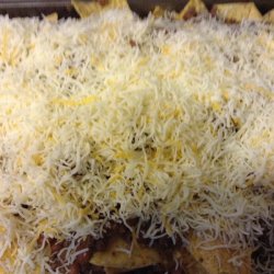3Spread the refried beans to cover the bottom of the prepared 9x13 inch pan. Layer the cooked ground beef and onions evenly over the refried beans. Pour the jar of salsa over the ground beef and spread 2 cups shredded Cheddar cheese over the salsa layer.