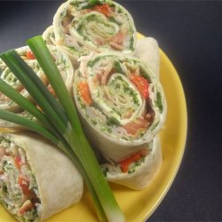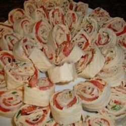 2Combine the chopped bacon, reserved bacon drippings, cream cheese, tomato, green onions, and pesto in a large bowl; mix well. Evenly spread the cream cheese mixture on the tortillas; top each with a slice of turkey. Roll tortillas up tightly, and cut into 1/4 inch slices. Discard rounded ends.