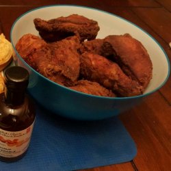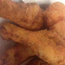 2Add 1/2 to 3/4 inch oil to a large, heavy skillet. Heat to approximately 365 degrees F (185 degrees C). Place chicken pieces in hot oil. Cover, and fry until golden, turning once, 15 to 20 minutes. Drain on paper towels.