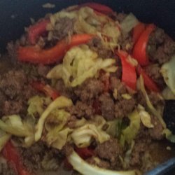 1Heat a wok or large skillet over medium-high heat, and add oil. Saute garlic for about 5 seconds, then add ground beef. Stir-fry until beef is evenly brown. Stir in cabbage and pepper, and cook until vegetables are tender, and beef is fully cooked. Stir in soy sauce. Mix together cornstarch and water, and stir in. Season with pepper. Cook, stirring, until sauce has thickened.