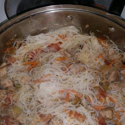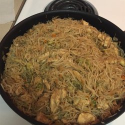 2Heat oil in a wok or large skillet over medium heat. Saute onion and garlic until soft. Stir in chicken cabbage, carrots and soy sauce. Cook until cabbage begins to soften. Toss in noodles, and cook until heated through, stirring constantly. Transfer pancit to a serving dish and garnish with quartered lemons.