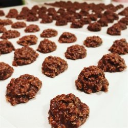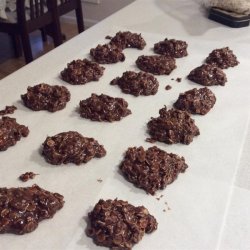 2Stir together oats, peanut butter and vanilla with a big wooden spoon or Kitchen Aid. Pour the hot mix over the oatmeal mix and drop on wax paper.
