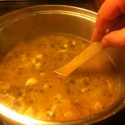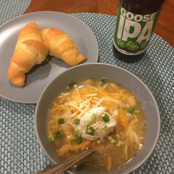 "Delicious white bean chili. Cha Cha says: 'It's kinda spicy, so watch out!' Substitute mild green chiles for the jalapenos if you're scared! Use more chicken and cheese as desired."