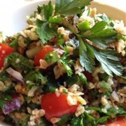 3Drain the bulgur and return it to the bowl. Add the cooked onion, chopped tomatoes, cucumber, green and red bell peppers, green onions, parsley, mint, and red pepper flakes. Drizzle with 2 tablespoons olive oil, the lemon juice, and the pomegranate molasses. Toss gently until the salad is thoroughly combined. Serve immediately, or refrigerate until serving.