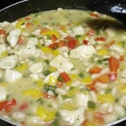 2Saute the onion, red bell pepper, yellow bell pepper, jalapeno chile peppers and garlic in the same skillet. Return the chicken, along with the ginger, salt, sage, cumin and white pepper. Mix thoroughly.