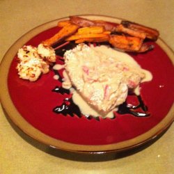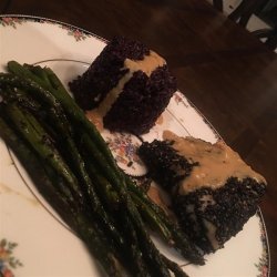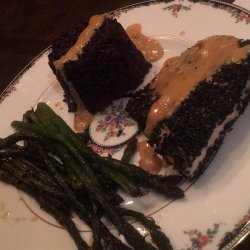 "Mahi mahi fillets are encrusted with black and white sesame seeds, and pan seared. The sauce is rich and creamy, and flavored with soy, ginger, shallots, and shiso (a Japanese herb related to basil and mint)."
