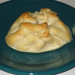 3Open package of crescent rolls. DO NOT divide them into triangles as you usually would! Keep every 2 triangles together, forming 4 squares. Pinch the 'seam' in the middle of each square closed and pat each one out into a larger square. Put a spoonful of the chicken mixture in the center of each square. Fold the corners up into the center, layering like flower petals so that the roll is kind of sealed. Repeat with all 4 squares.