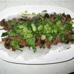 3Brush grill grate with oil, and discard marinade. Arrange skewers on the grill. Cook 5 minutes per side. Serve hot from skewers, or remove from skewers and serve on lettuce leaves. Garnish with cilantro, mint, basil, and sliced green onions.