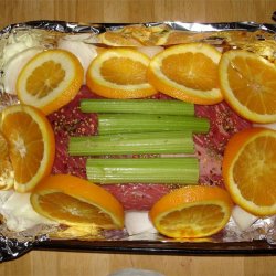 2Rinse the brisket, and pat dry. Rub with pickling spice, and place in the prepared roasting pan. Arrange celery, orange and onion slices on and around the roast. Pour in 1/2 cup of water, and wrap aluminum foil up over the roast tightly, making sure the ends are sealed.