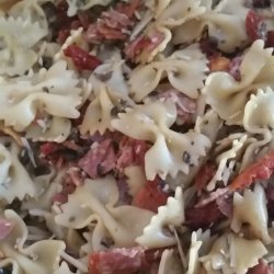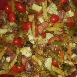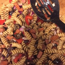 2In a large bowl, combine the pasta, salami, pepperoni, Asiago cheese, black olives, red bell pepper, green bell pepper and tomatoes. Stir in the envelope of dressing mix. Cover, and refrigerate for at least one hour.